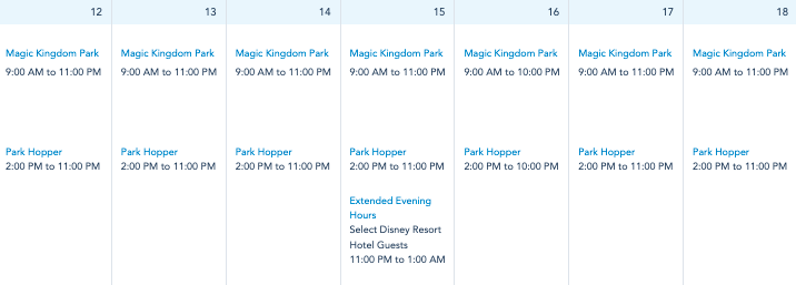Magic Kingdom will be open from 9AM until 11PM on June 12th, 13th, 14th, 15th, 17th, and 18th. There will be Extended Evening Hours for select Disney resort guests until 1AM on June 15th, and the park will be closing one hour early at 10PM on June 16th.