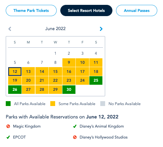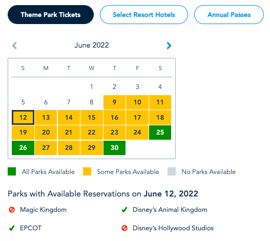 If you have a Theme Park Ticket, you can only make reservations at EPCOT on June 12th through the 18th, Animal Kingdom on June 12th, 15th, 17th, and 18th, and Disney’s Hollywood Studios on June 18th. Magic Kingdom is sold out every day next week!