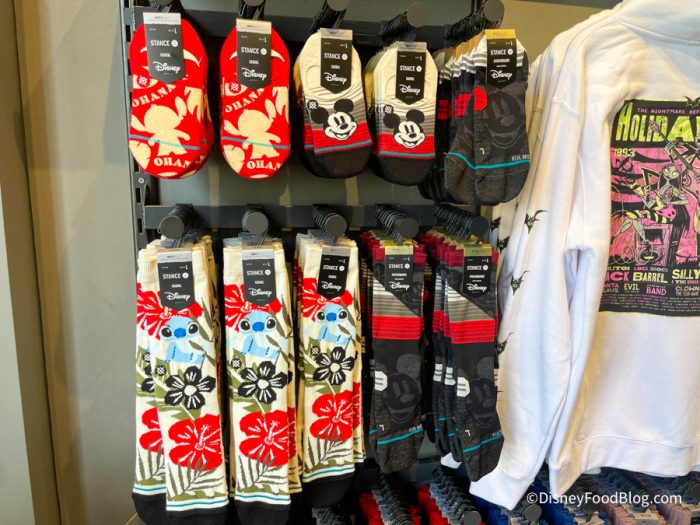 Both pairs of socks are $19.99. The long socks are cream colored and have Stitch with some Hawaiian flowers, and the short socks are red with Stitch, flowers, and the word “Ohana.”