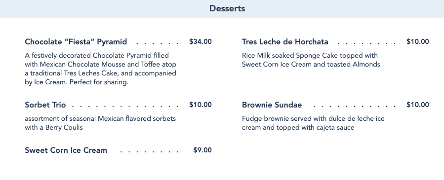 And of course, there are a few desserts to choose from. We tried the Chocolate Fiesta Pyramid when it first debuted, and you can read all about that here.