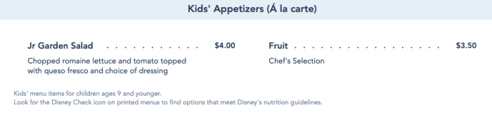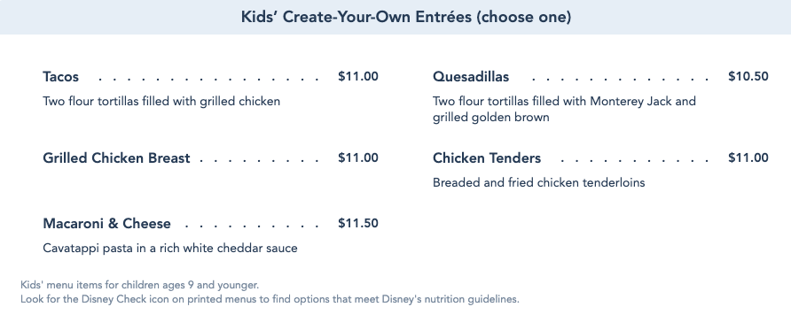 Like most Disney World table service restaurants, kids can choose their own adventure when it comes to their meal, with appetizers…