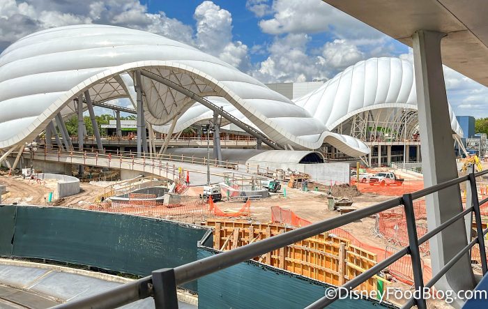 Of course, Magic Kingdom’s BIG project currently is the TRON coaster over in Tomorrowland. We got a great view of construction from a ride on the PeopleMover, and it looks like work is continuing on the pathway leading up to the ride building.