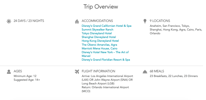 The tour lasts almost a full month, reaches a total of 9 locations around the world, and includes 68 meals throughout the experience. Guests are required to be at least 12 years old in order to go.