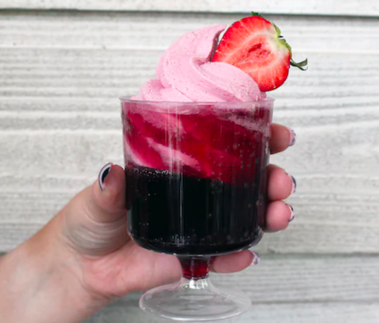 new treat at swirls on the water disney springs dole whip float rosa regale sparkling red wine dole whip strawberry fresh strawberry slice By Sara McOmber Leave a Comment