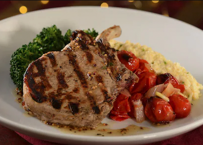 - NEW Grilled Bone-in Pork Chop, served with creamy polenta, roasted tomatoes, mustard vincotto, and charred broccolini