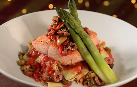 - An enhanced version of the Sustainable Fish dish (right now the fish is served with with Pappardelle Pasta tossed with Puttanesca Sauce and Grilled Asparagus; Disney hasn’t yet explicitly stated what the changes or “enhancements” will be)