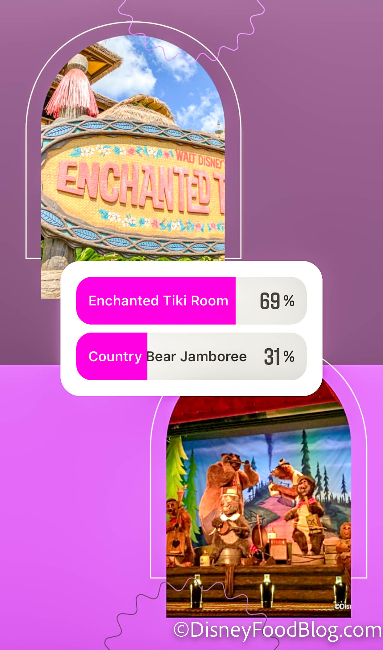 Walt Disney’s Enchanted Tiki Room or Country Bear Jamboree? That was the next decision our followers had to make, and they choose singing birds over singing bears.