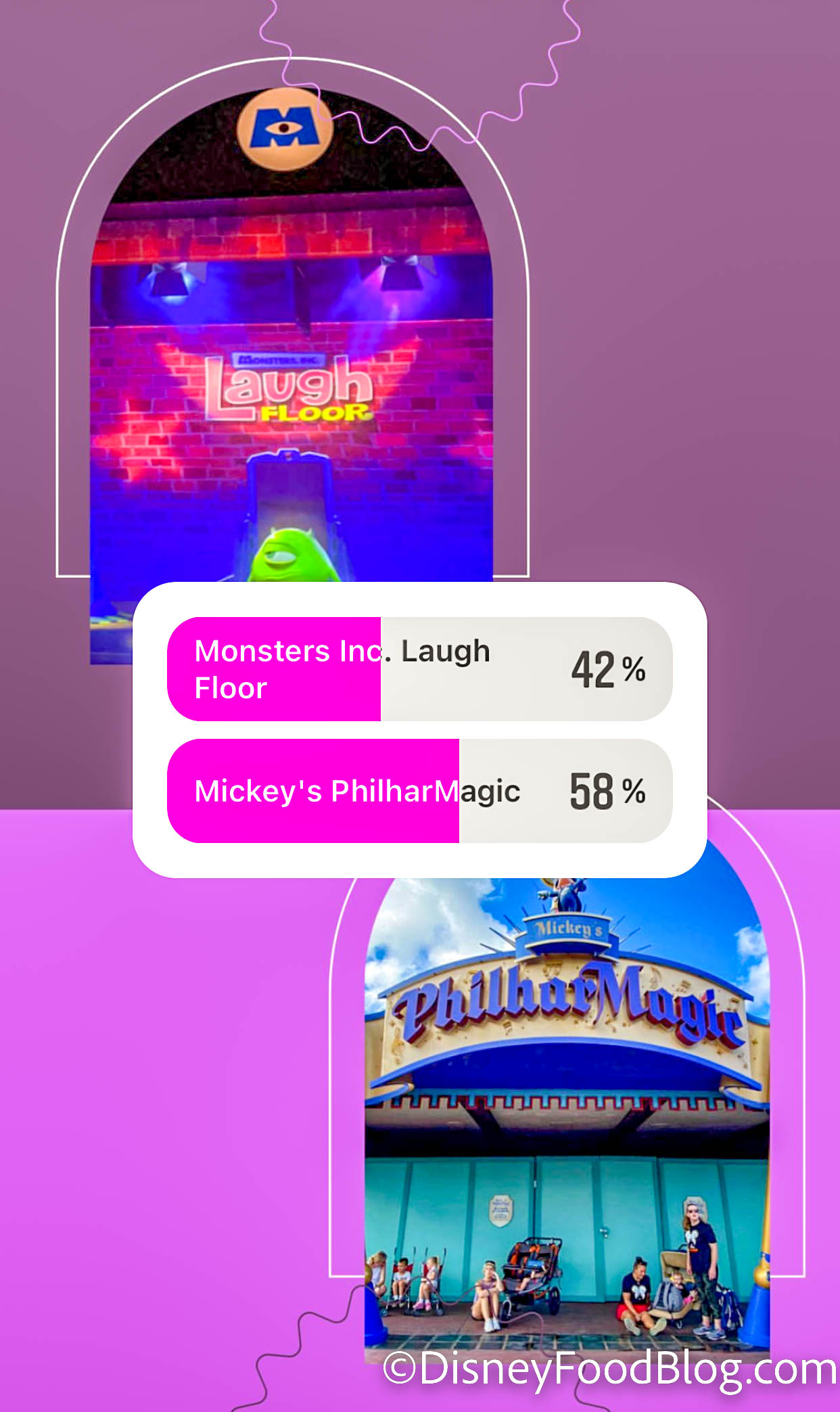 This next one was a little more evenly matched. Mickey’s PhilharMagic won out over Monsters, Inc. Laugh Floor. (Our guess is that people are bitter because they didn’t get picked to be “that guy!”)