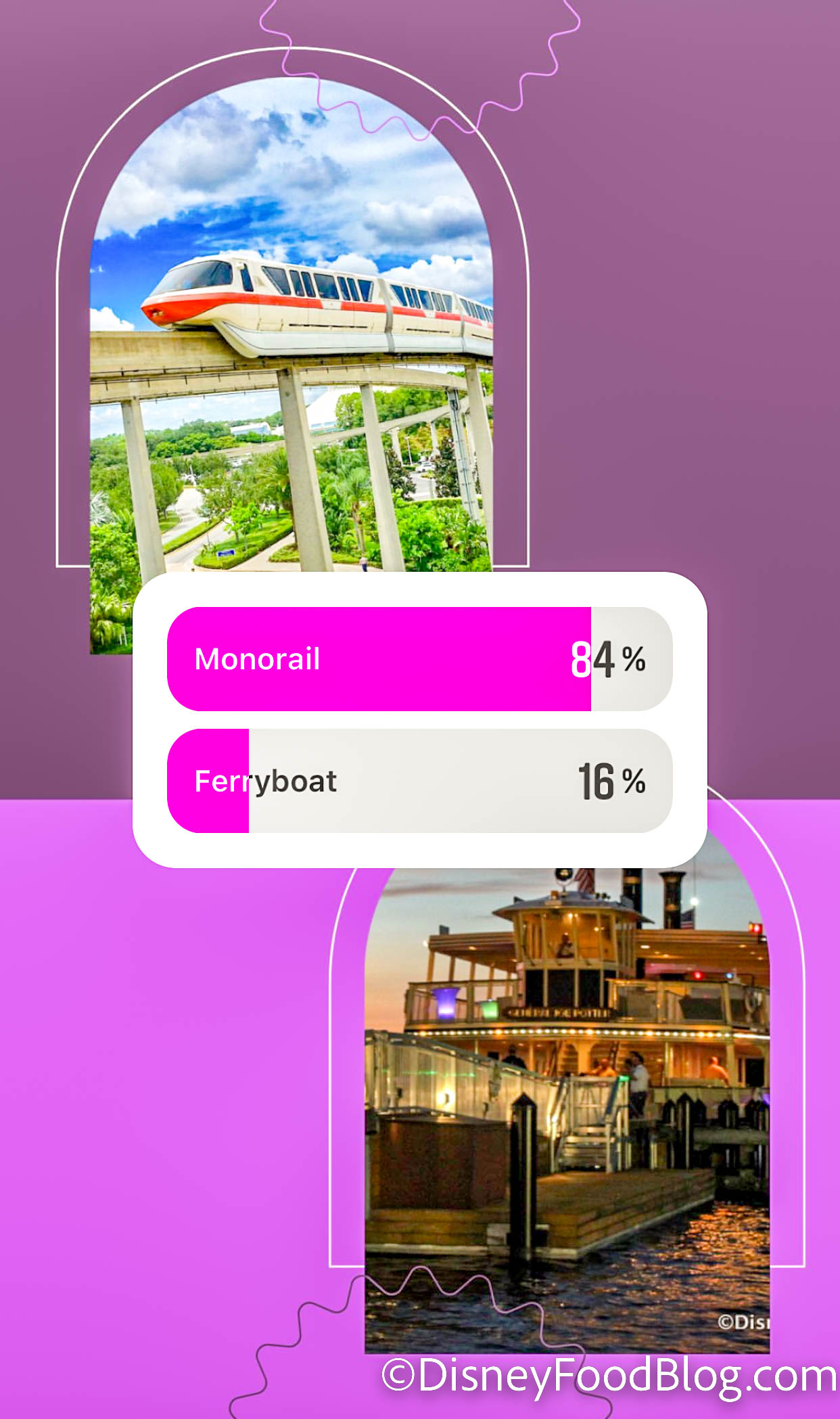 Another one that wasn’t even close? Monorail vs. Ferryboat! The poor ferry only got 16% of the votes — we have to be honest though, there is something incredibly classic about that monorail ride through the Contemporary Resort and into Magic Kingdom.