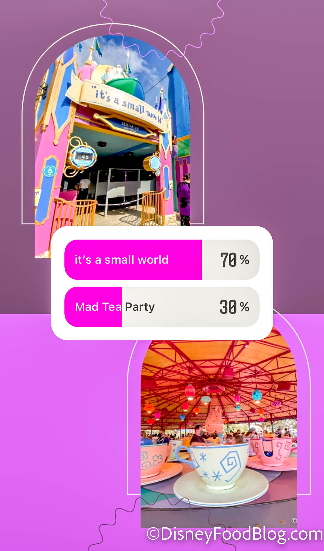 It turns out that people prefer singing puppets over becoming a human centrifuge, because “it’s a small world” defeated Mad Tea Party, which only got 30% in this poll.