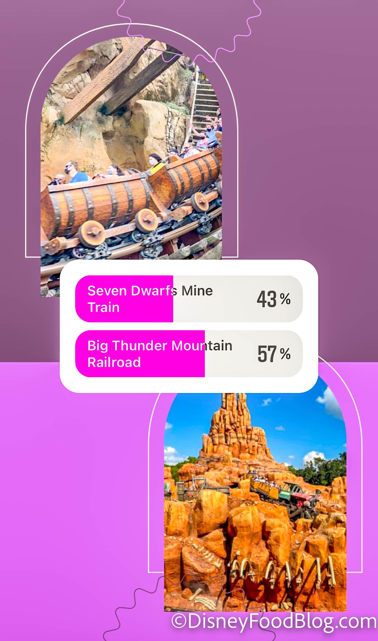 We pitted Splash and Space against each other, so it was only fair to do the same to Seven Dwarfs Mine Train and Big Thunder Mountain Railroad. Big Thunder won this one by a bit more than Space did, taking home 57% of votes.