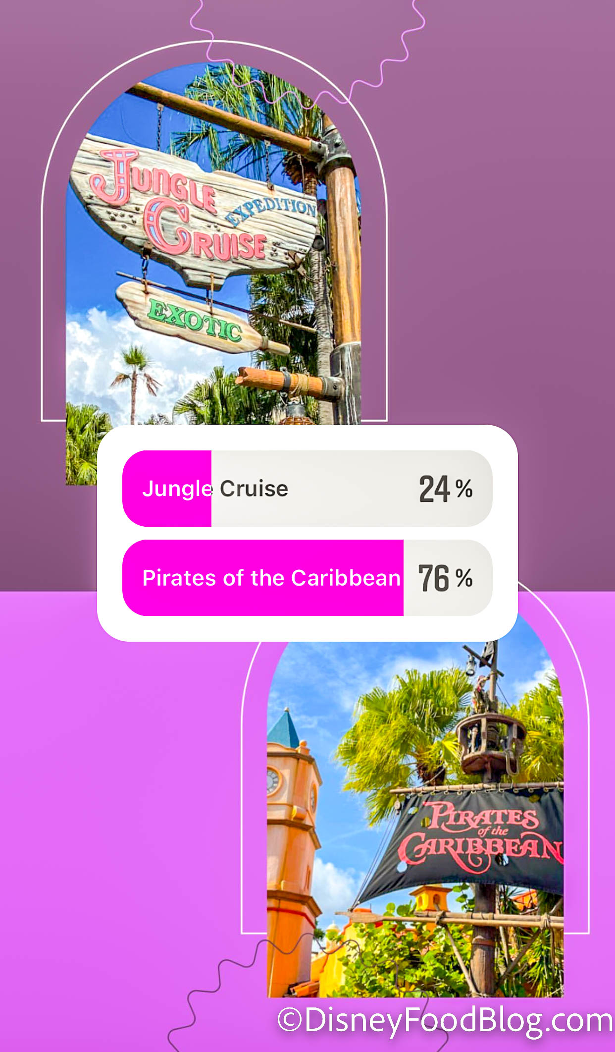 In results that were a tad bit shocking, Pirates of the Caribbean beat Jungle Cruise with a whopping 76% of the votes! We had a feeling Pirates would win, but we didn’t expect it to be this big of a landslide. Justice for the Skippers!