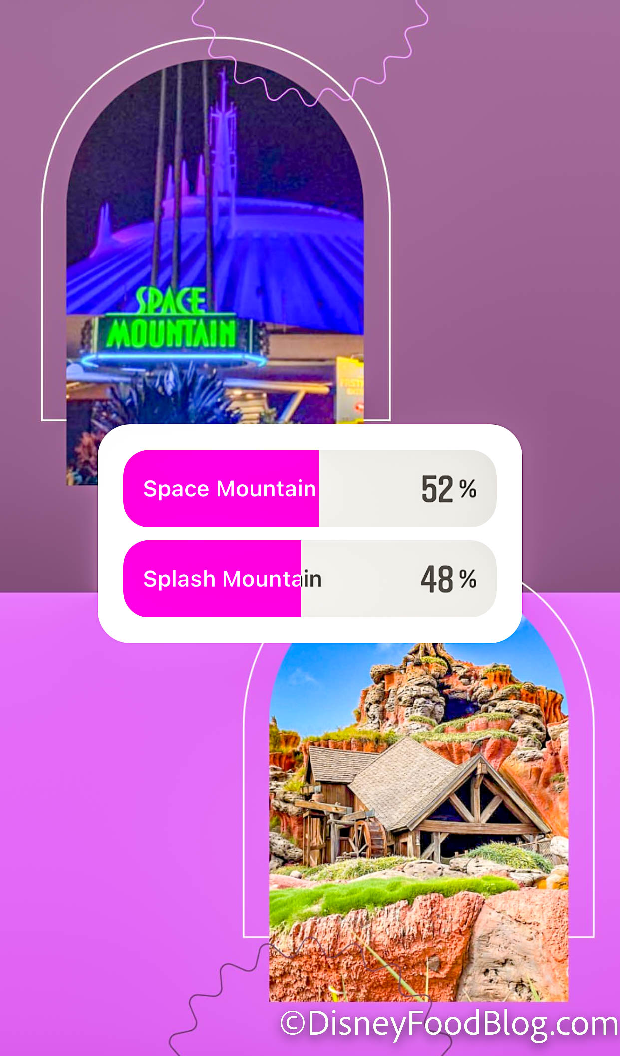 Next up we have a throwdown between two of Magic Kingdom’s mountains, which means we’re knocking out some heavy hitters really early in the game! Space Mountain barely edged out Splash Mountain, taking the victory with 52% of votes.