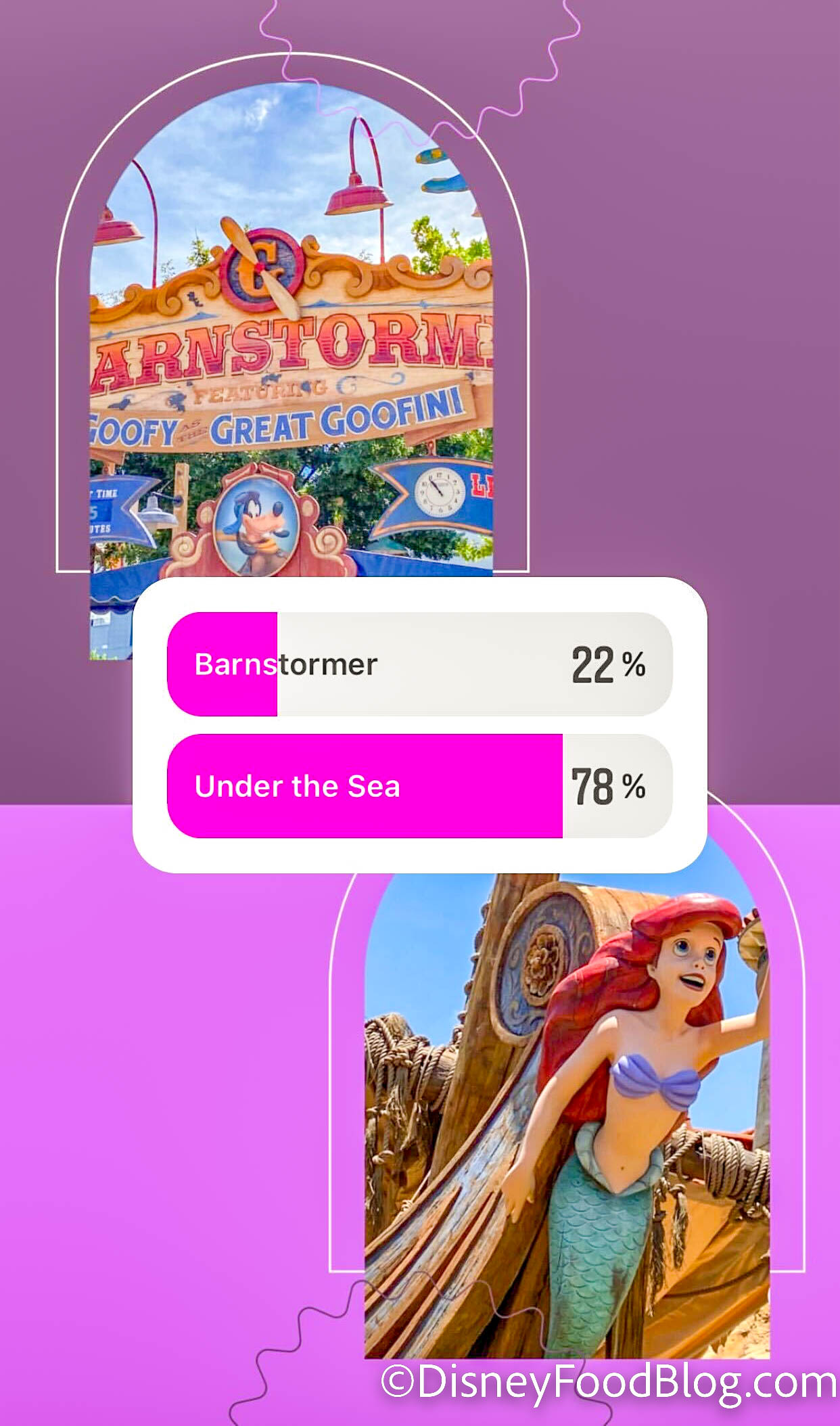 We’re starting this list out with a complete blowout — The Barnstormer vs. Under the Sea — Journey of the Little Mermaid. Ariel took the lead SIGNIFICANTLY here with 78% of the votes!
