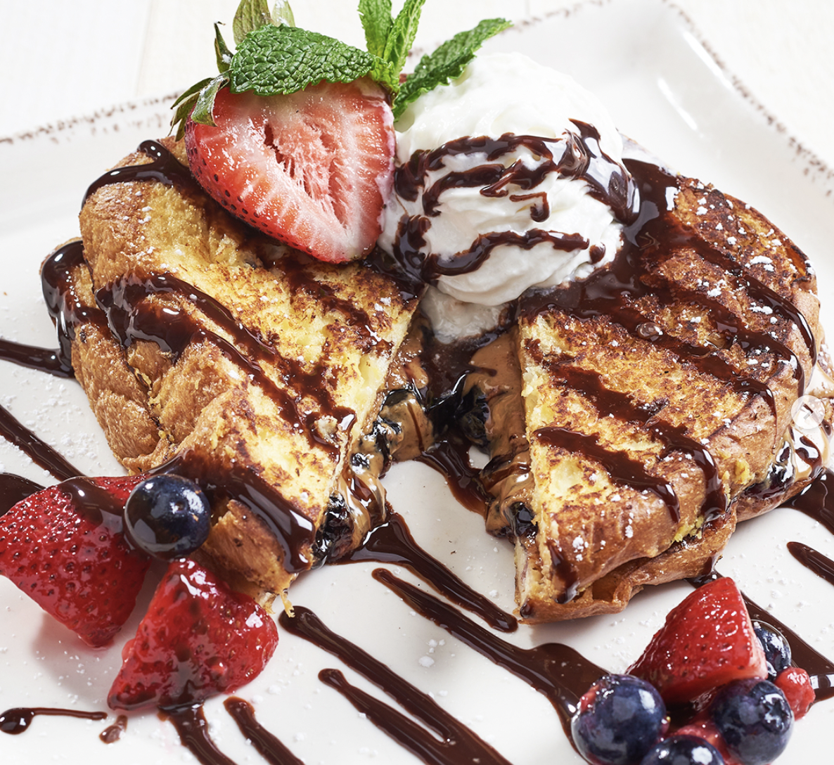 First up, there’s the PB&J French Toast, which is made with French toast stuffed with peanut butter & jelly, chocolate sauce, glazed berries, and whipped cream, plus your choice of side item!