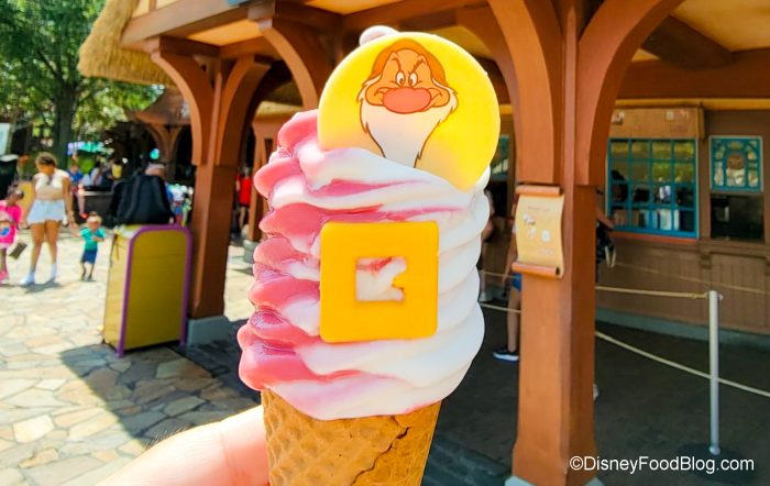So far, we’ve only seen 3 out of 7 of these Seven Dwarfs treats — the Caramel and Chocolate Espresso Doc Cone, the Cranberry and Vanilla Grumpy Cone, and the Chocolate Barqs Root Beer and Vanilla Sneezy Cone.
