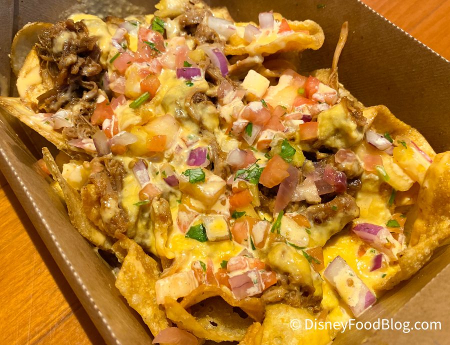 Neither of these options is a “bad” choice since it all comes down to your taste, but our team definitely prefers the Pulled Pork Nachos! They’re topped with cheese, spicy mayonnaise, pico de gallo, and pineapple salsa, which gives them a more unique flavor that you can’t find elsewhere around Disney World.