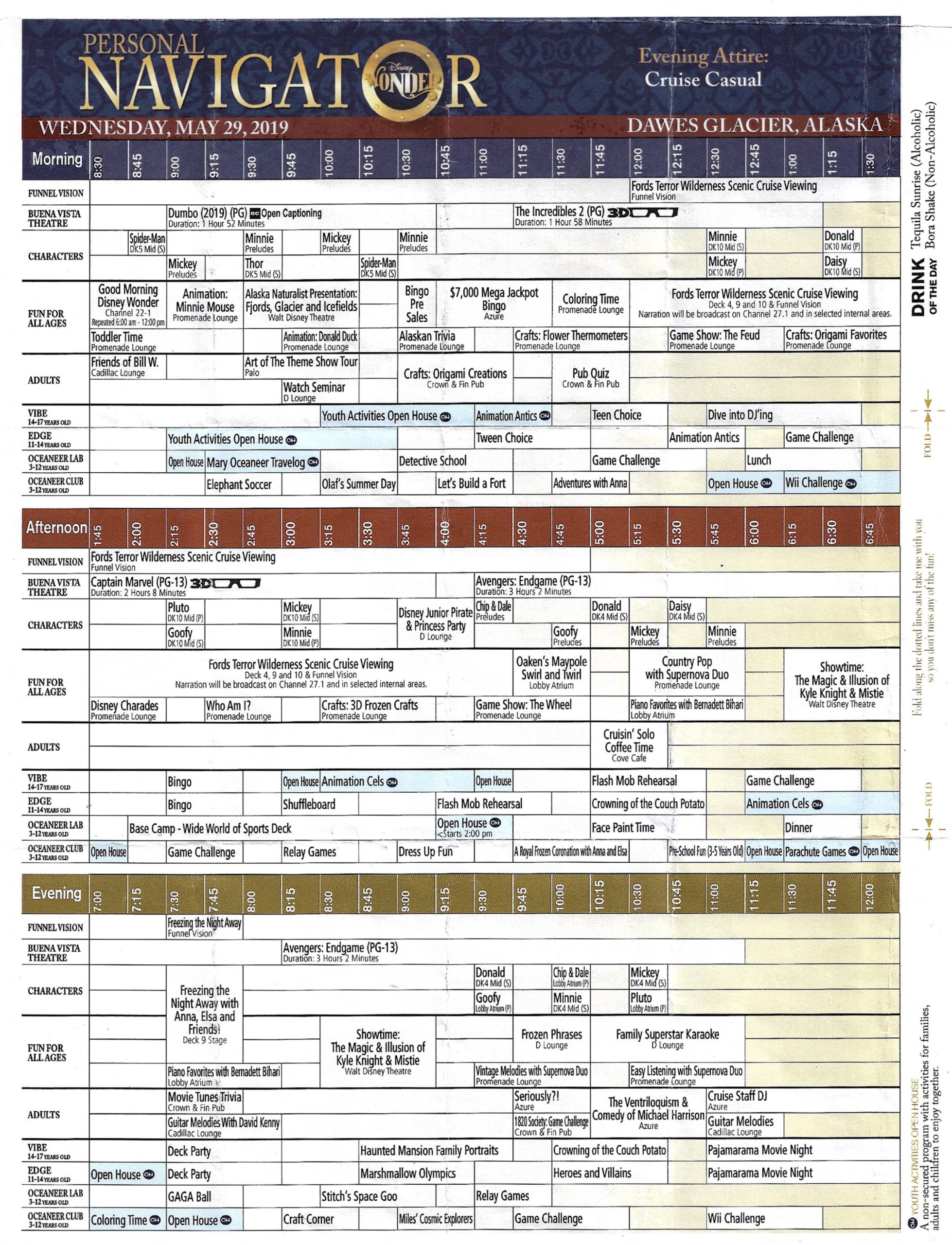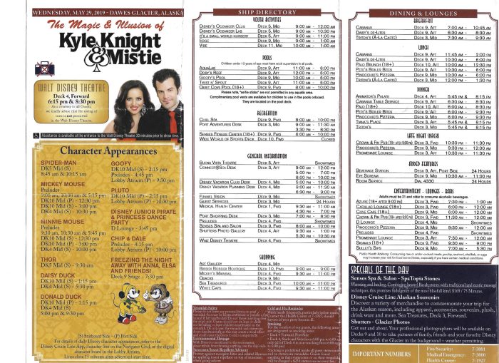 Here’s a peek at a Disney Cruise Line navigator from 2019 for a trip to Alaska. Many, if not most of these are totally included in the cost of the cruise.