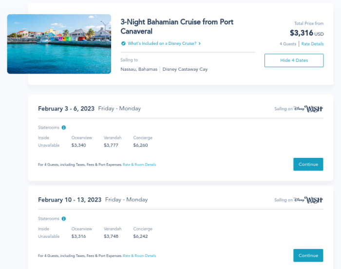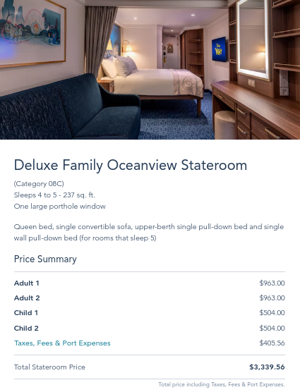 When booking your Disney Cruise Line vacation, you’ll pay a set rate for yourself and those traveling in your party. Here are some sample prices for a 3-night Bahamian cruise for a family of 4 (2 adults, 2 kids under 9) in 2023.