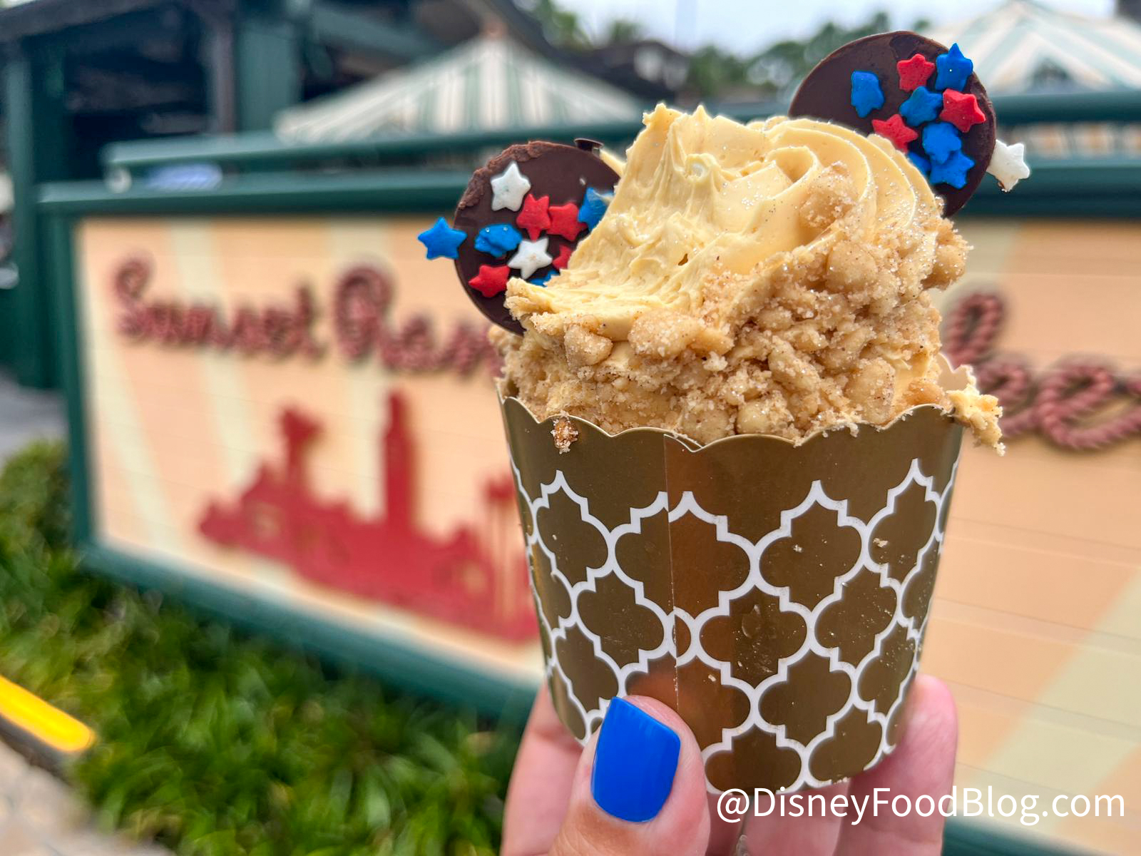 - Apple Pie Cupcake: Yellow cupcake filled with an apple pie filling, topped with salted caramel buttercream and cinnamon streusel, and garnished with rainbow silver sparkle, red, white, and blue Mickey ears
