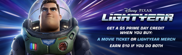 You can get a $5 credit for Amazon Prime Day when you buy either a movie ticket to see Lightyear, or buy Lightyear merch! And, if you do both, you can get a $10 credit!