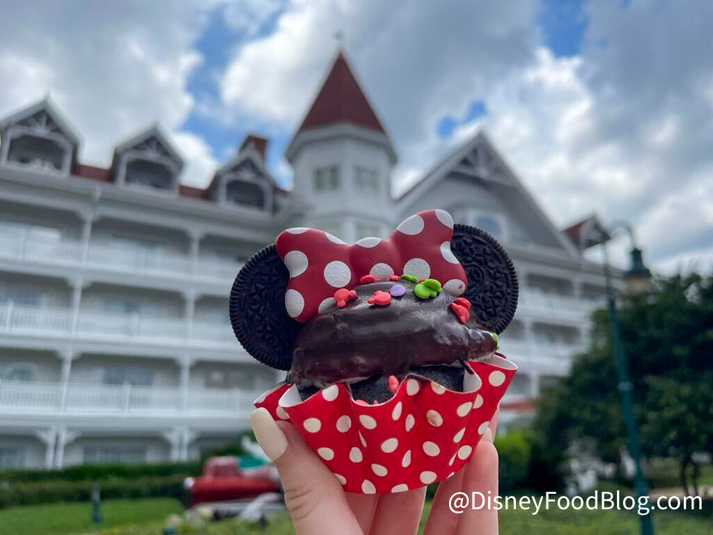 Just look at this thing! This treat is a chocolate cupcake topped with cookies and cream frosting covered in chocolate ganache, and has cookies and cream filling. Two Oreos make up Minnie’s ears, and a milk chocolate Minnie Mouse bow and multi-colored Mickey sprinkles complete the look.