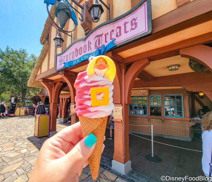 It’s a cranberry and vanilla soft-serve with a chocolate belt buckle and coin! It’s a great refreshing option in Magic Kingdom!