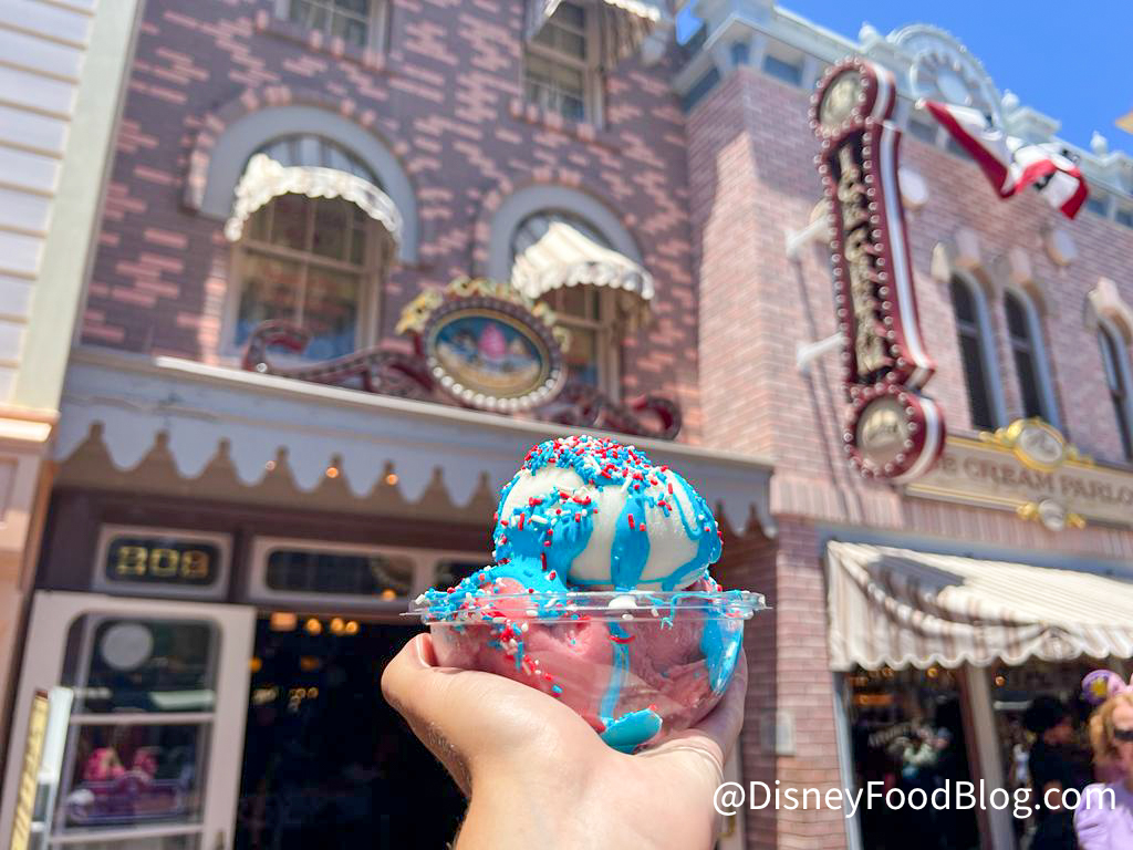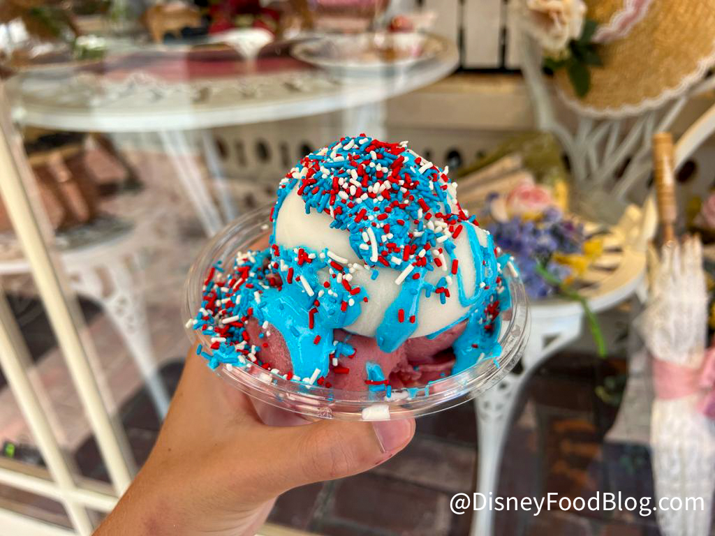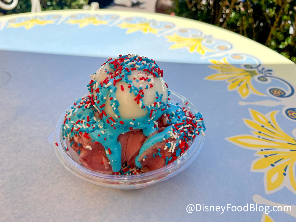 This treat features cherry and lemon sorbet topped with blue raspberry marshmallow creme (isn’t THAT a flavor combination!), and sprinkles. It definitely gives off 4th of July vibes!