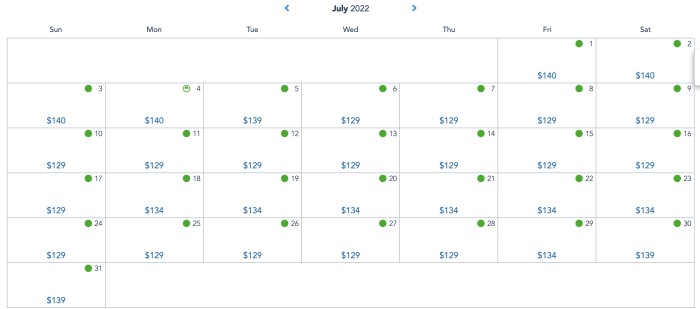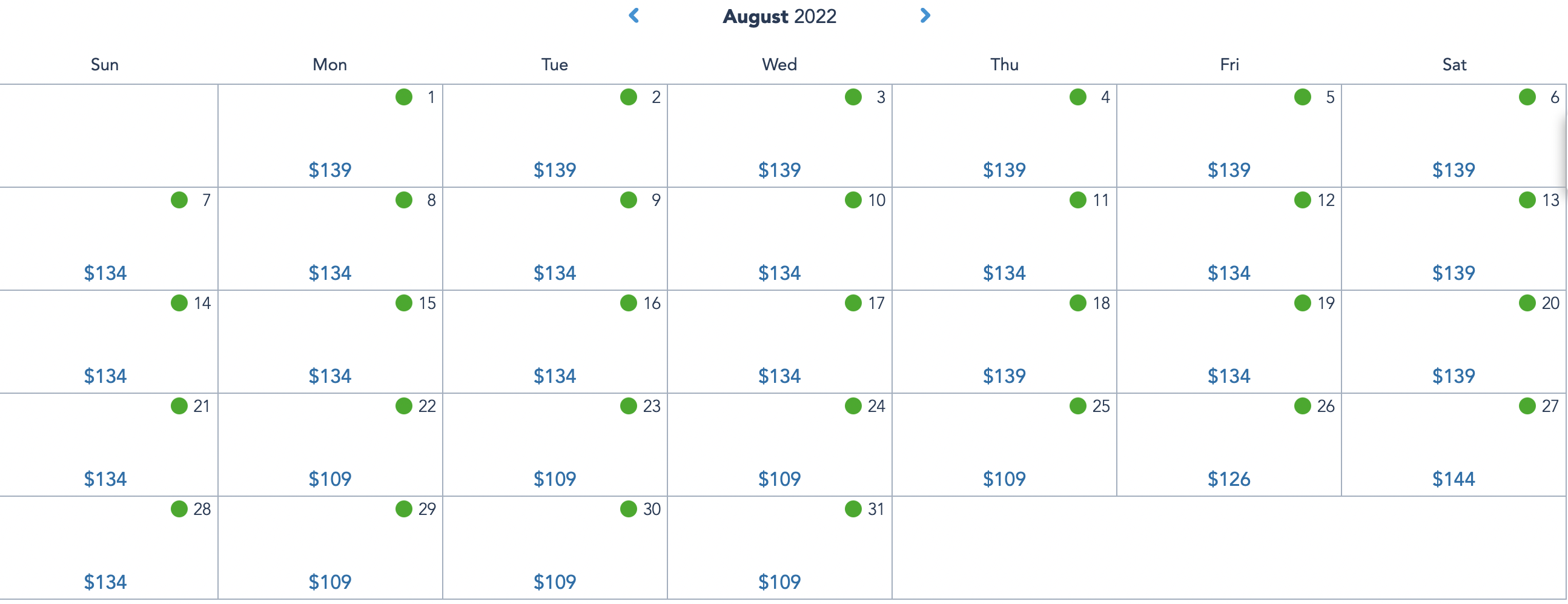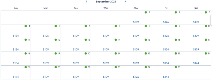 In September, the lowest ticket prices are also at $109. These days include September 1st, 6th-8th, 12th-15th, 19th-22nd, and 26th-28th.