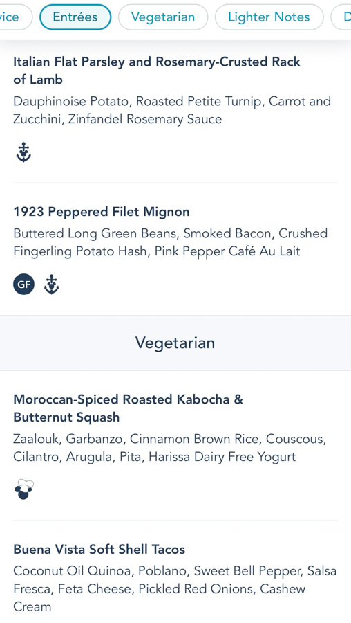 Not overly impressed with the menu’s. Very exotic for a meat and potato’s crowd. I have always had a problem with the dit down dining options. Many times I have had to eat off of the children’s menu… looks like the tradition will continue.