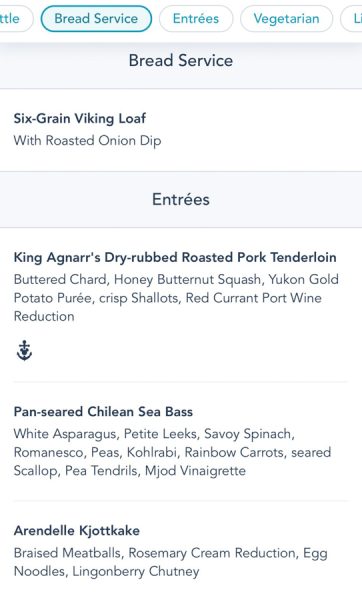 Guests will receive bread service, and can choose between quite a few entrées, like King Agnarr’s Dry-rubbed Roasted Pork Tenderloin!