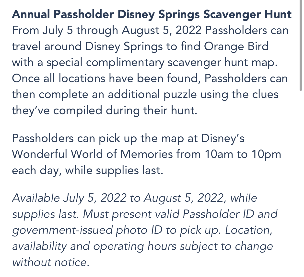 Finally, Passholders can participate in the Annual Passholder Scavenger Hunt. From July 5th through August 5th, Passholders are invited to travel around Disney Springs to find all the hidden Orange Birds! A complimentary scavenger hunt map will be provided. Once all Orange Birds have been found, there’s one more puzzle to figure out using previous clues. Maps can be picked up at Disney’s Wonderful World of Memories from 10AM to 10PM each day.