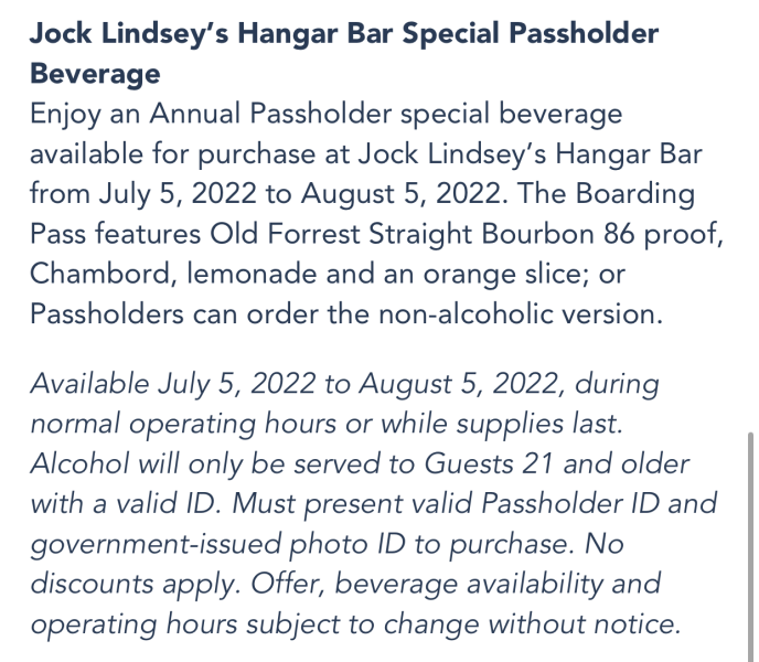 Need a cold beverage? Head on over to Jock Lindsey’s Hangar Bar for a Passholder-Exclusive drink! The Boarding Pass (yep, that’s the drink’s name) is made with Old Forrest Straight Bourbon 86 Proof, Chambord, Lemonade, and an Orange Slice. Don’t want the alcohol? No problem — a non-alcoholic version is available, too. This drink will also be available from July 5th through August 5th.