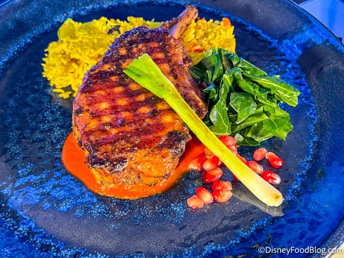 While we didn’t get to eat it, we did get to see what the Berbere Spiced Pork Chop looks like as part of the media event. This dish is served with Wakandan Vegetable Pilau, Pomegranate, Red Pepper Sauce, Rainbow Chard, and Roasted Scallion.
