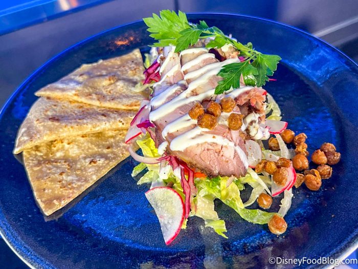 And we got to take a peek at the Lamb Shawarma Salad, which features slow-roasted cumin spiced pulled lamb leg in mini pitas, with iceberg, endive, romaine lettuce, sumac onions, vine tomatoes, pickled red cabbage, roasted chickpeas, cucumber, and lemon yogurt dressing.
