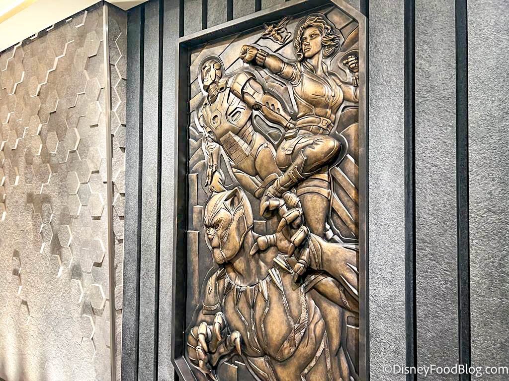 As you walk into the area, your dining experience starts with some pretty incredible carvings/artwork pieces featuring some of your favorite super heroes. There’s one with Iron Man, Black Panther, and more.