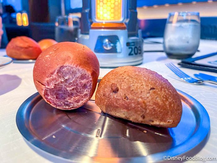 Our meal started with some complimentary bread and dipping sauce! The bread served was marble bread (get it — marbel, marvel — we see what you did there Disney!), and it came with a red bell pepper dipping sauce.