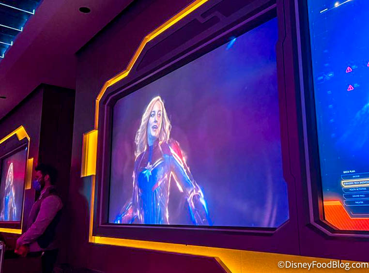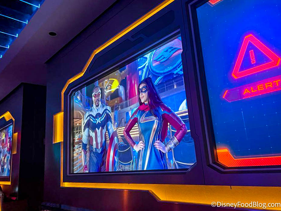 On the screens, you’ll see the heroes and Ultron engaged in an EPIC battle right there on the Disney Wish — fighting in the hallways, on the upper decks, and elsewhere on the ships. WHEW. Lucky you’re right in the dining room so you aren’t caught up in the fight!