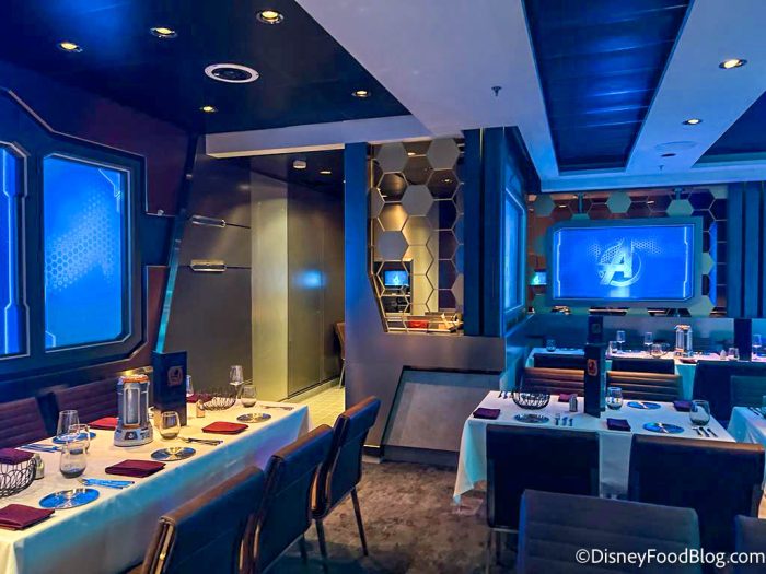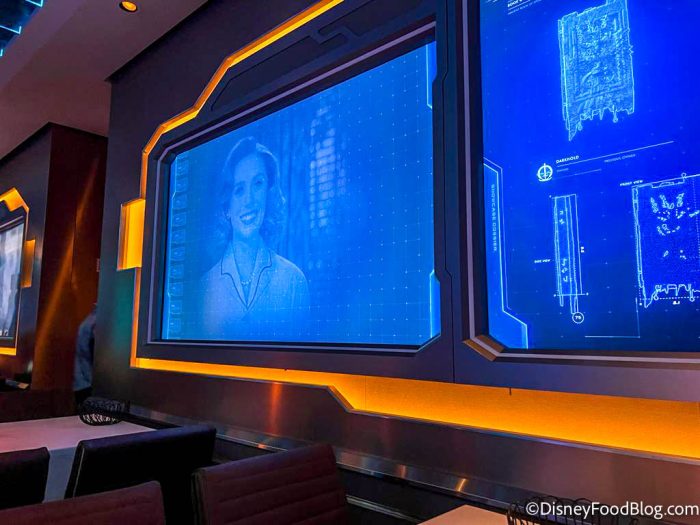 Then, it’s time to relax, enjoy dinner with your family, chat about ALL that time you spent riding the AquaMouse (Disney’s first attraction at sea!), and just catch up. As you enjoy dinner, you’ll get to look around at the monitors in the room, which will be giving a “presentation” of sorts about Super Hero tech used in the Marvel films.