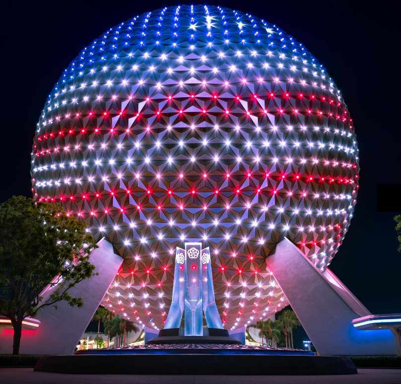 Riddley wrote, “Spaceship Earth is ready to shine brightly with a very limited-time ambient lighting design celebrating Independence Day ”