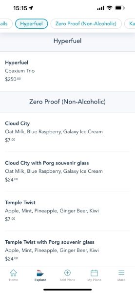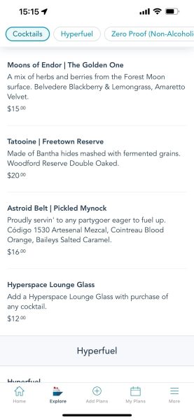 There’s also a Hyperfuel Drink — Coaxium Trio for $250. You’ll also find several non-alcoholic options here, one of which comes in the Porg Souvenir Glass.