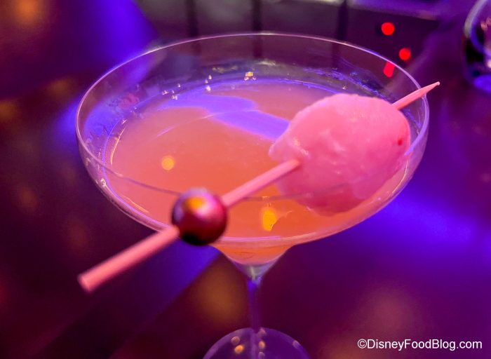 The Berken’s Flow ($16) has SelvaRey Coconut, Rumchata, Godiva Chocolate, and Coconut Water in it — PLUS the Disney Wish is written on top of it in an edible ink that glows under a blacklight.