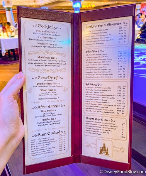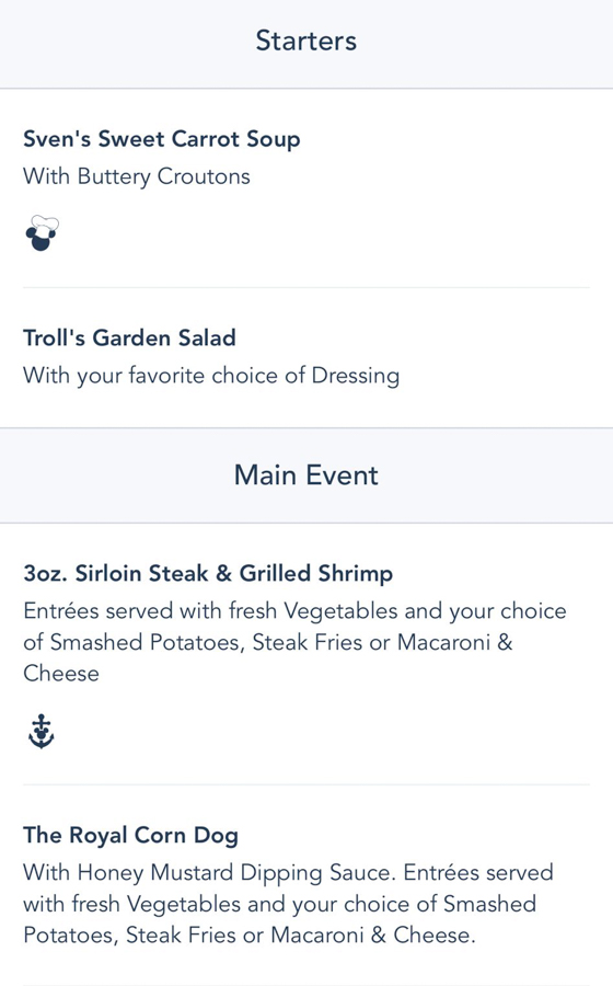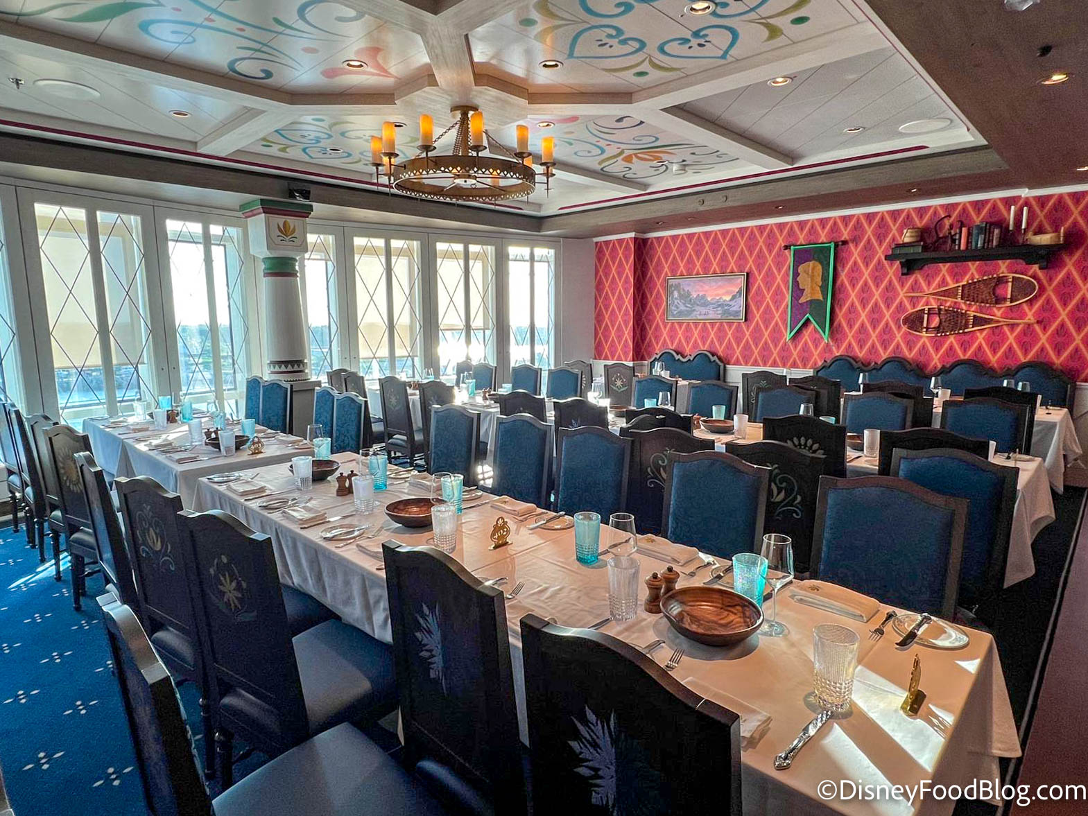 You can choose from seafood, rustic game dishes, and dishes that serve as a nod to the Frozen movies.