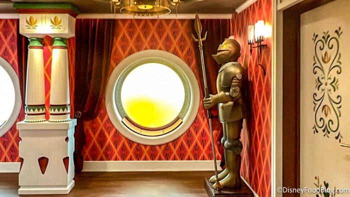 As you walk in, you’ll encounter lots of deep reds and greens. You’re essentially walking into a design meant to mimic some of the castle seen in the film.