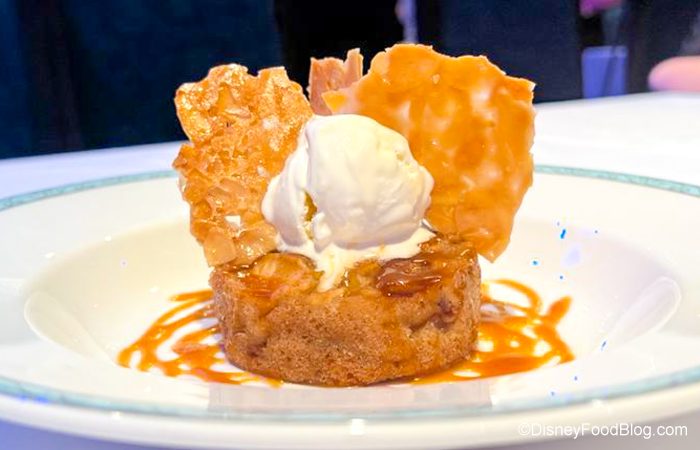 This was like a warm bread pudding with apple. The caramel sauce was nice and melty (who doesn’t like melty caramel?). The vanilla bean ice cream melting on top just made put this dessert over the top for us. The almond crunch isn’t anything exciting and we didn’t think this dessert was THAT more unique than anything you can find in Disney World.