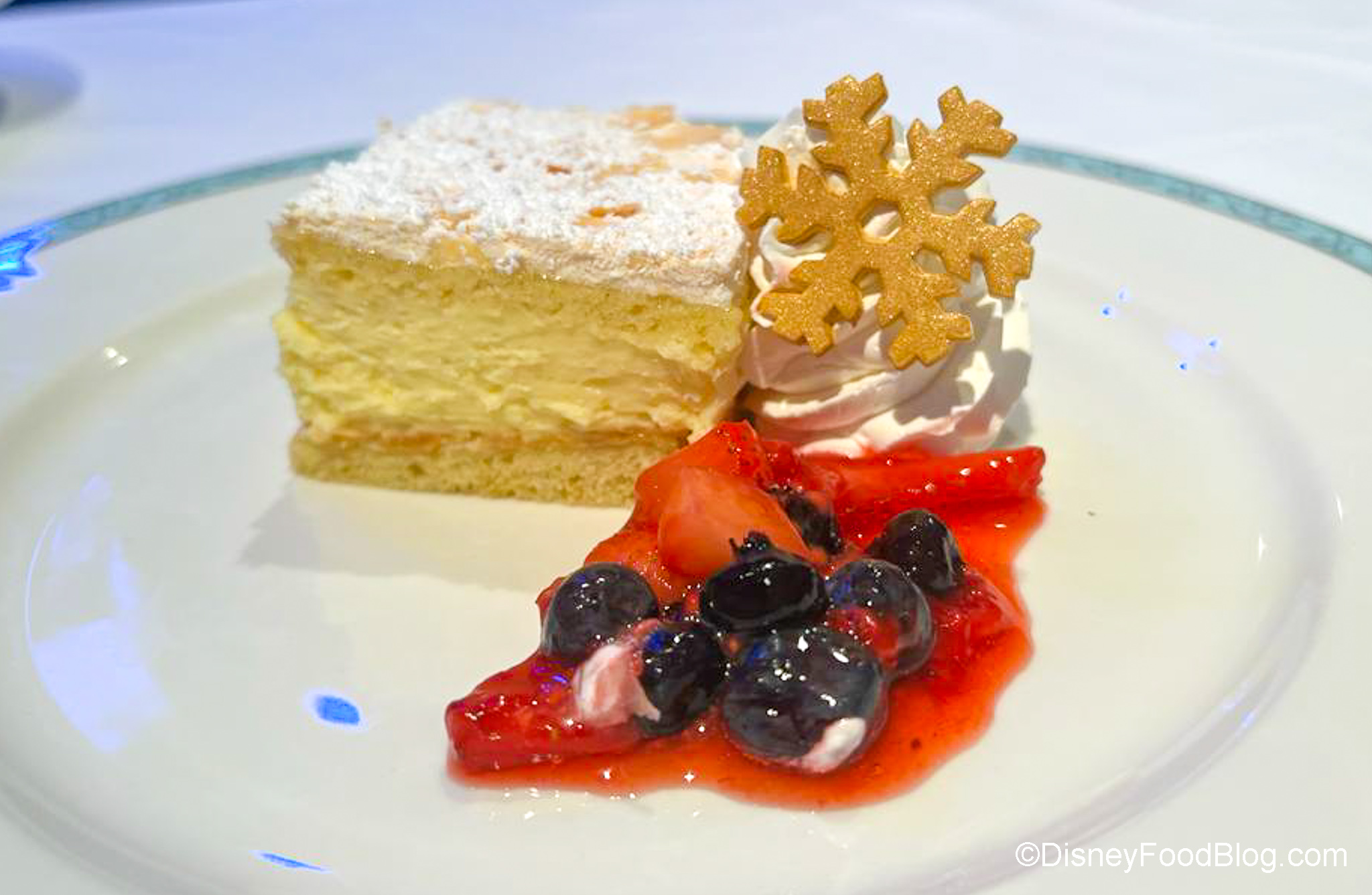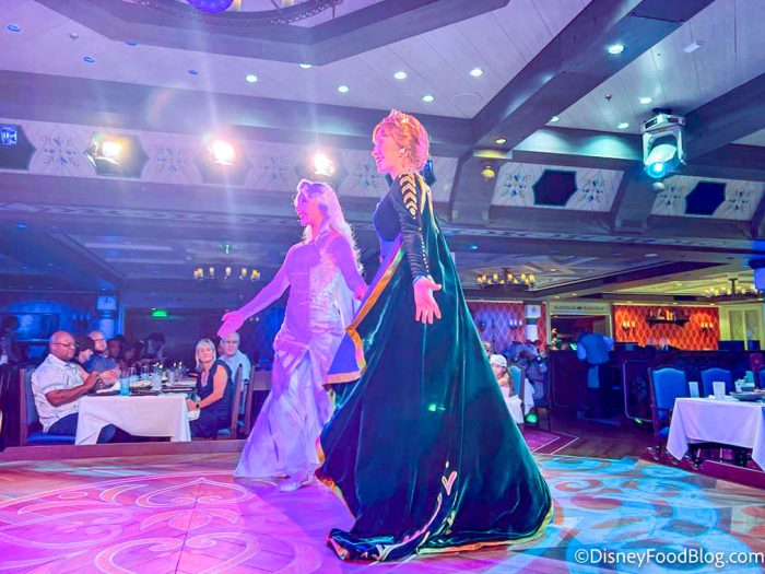 Although the show was supposed to involve some special effects (like fiber optics for the ice) and panoramic windows showing the Northern Lights, we didn’t really see that during our dining experience. There was a moment when Elsa was “making magic” in the show, but nothing happened.