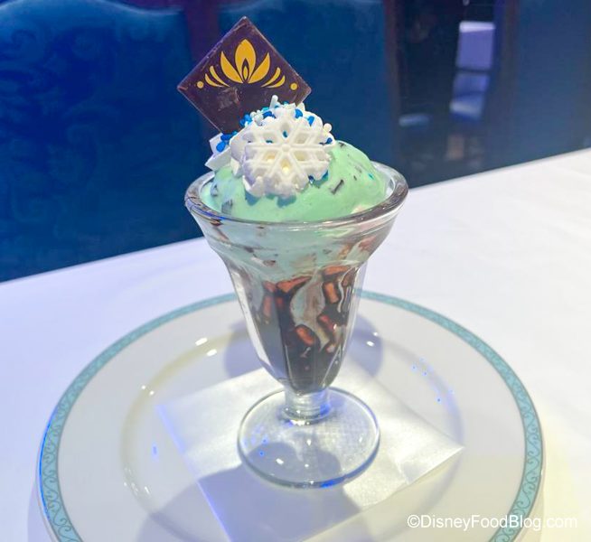 Finally, we dug into “It’s Elsa’s Coronation Sundae!”, made with Mint Chocolate Chip Ice Cream, Marshmallows, fresh Whipped Cream, and Snowflakes. It’s a sundae, so there’s nothing unique about it, but if you like Mint Chocolate Chip Ice Cream, this is sure to please. But be warned: we thought the snowflake would be white chocolate, but it was like a plasticky candy.