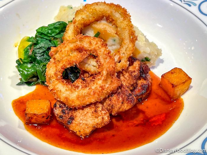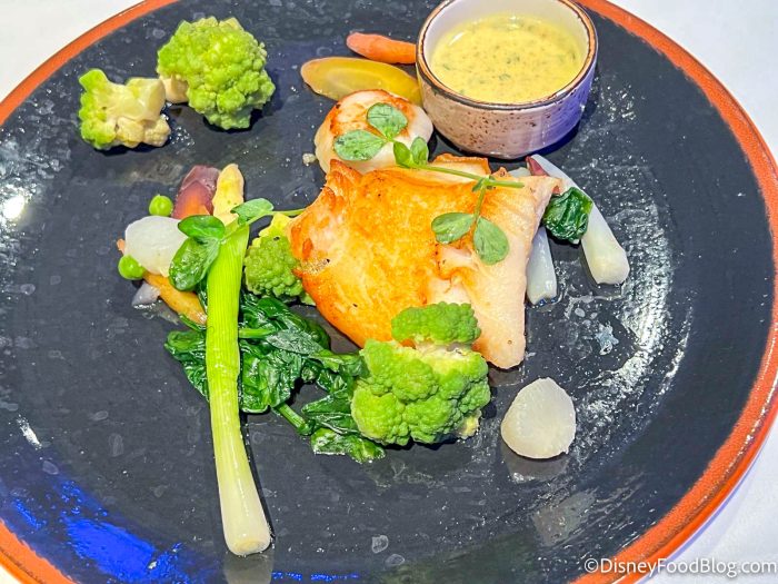 This was one of our top five things we ate during our time on the Wish! It was light and flaky with loads of flavor (and not too fishy). We also liked the bonus scallop on the side. We have generally loved Sea Bass dishes on ALL of our Disney cruises, and this one was a win for us, too.