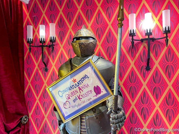 And one of the suits of armor has a sign congratulating Anna and Kristoff on their engagement!