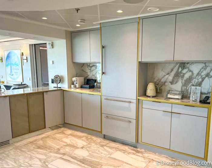 Next to the dining room is a pantry and wet bar, as well as a coffeemaker and electric kettle, plus cabinet space and lots of room on the countertops. The pantry is pre-stocked with sodas and water.